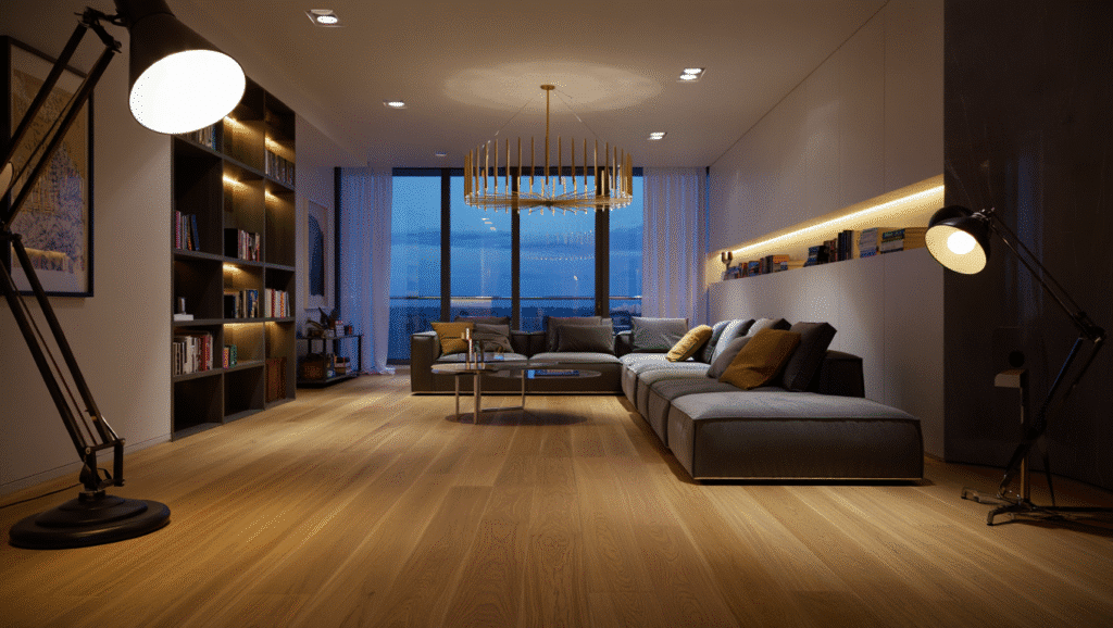 סלון גדול מאפשר יצירת אזורי תאורה מוגדרים ומורכבים יותר. כל אזור פעילות (ישיבה, קריאה, אוכל, עבודה) יכול לקבל טיפול תאורה ייעודי. גופי תאורה תלויים בגדלים שונים יכולים ליצור היררכיה ויזואלית ולחלק את החלל לאזורים.